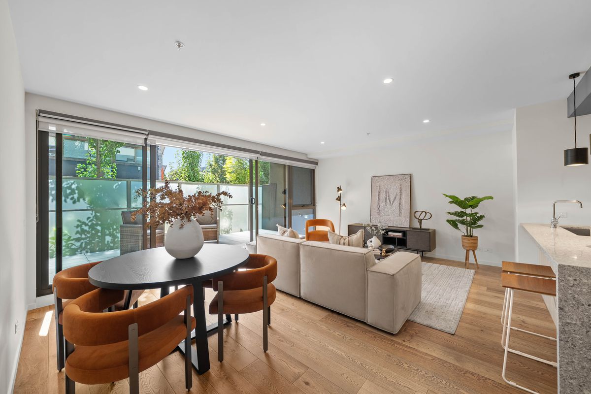 This chic apartment offers an elegant kitchen featuring European appliances, ample cupboard, and bench space. The heart of the apartment presents an expansive open plan living/dining area which seamlessly connects to a private outdoor terrace ideal for year-round entertaining.